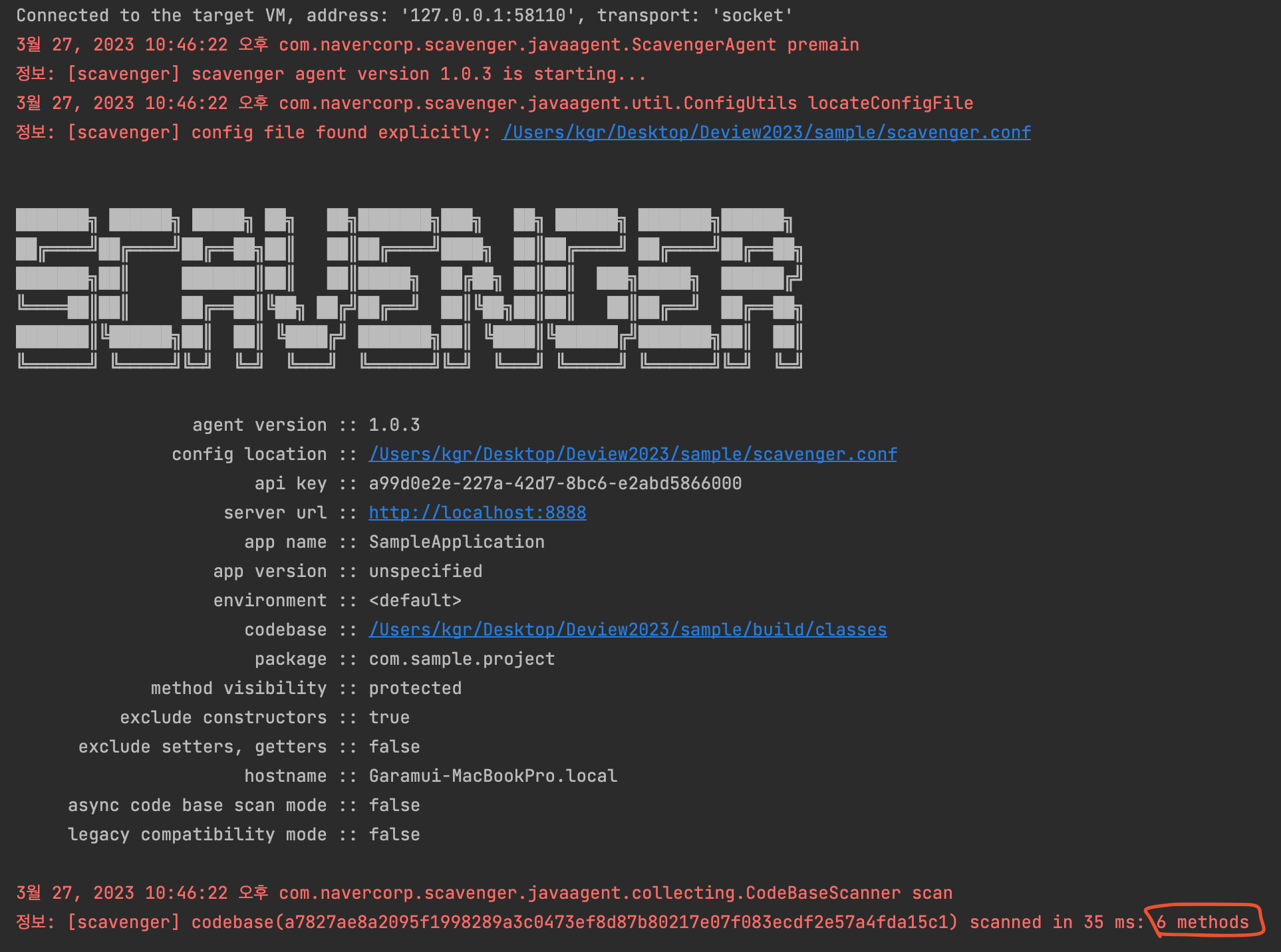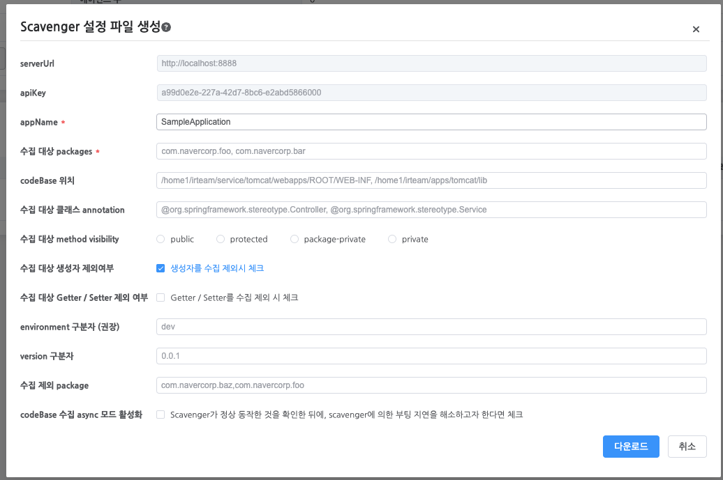 별표시가 있는 부분은 필수 입력 값인데, 내 생각엔 분석을 위한 class 파일을 확인해야하기 때문에 codeBase의 위치도 필수값이지 않나 싶다. 이 화면에서 만들어지는 .conf 파일은 가이드문서 내에서 정의한 프로퍼티별로 수동으로 입력가능하지만, api 키의 경우에는 Scavenger Client에서 만들어준 위와 같은 값을 사용해야 인증이 가능하다. 이외에 여러가지 옵션값들도 지정이 가능하다.