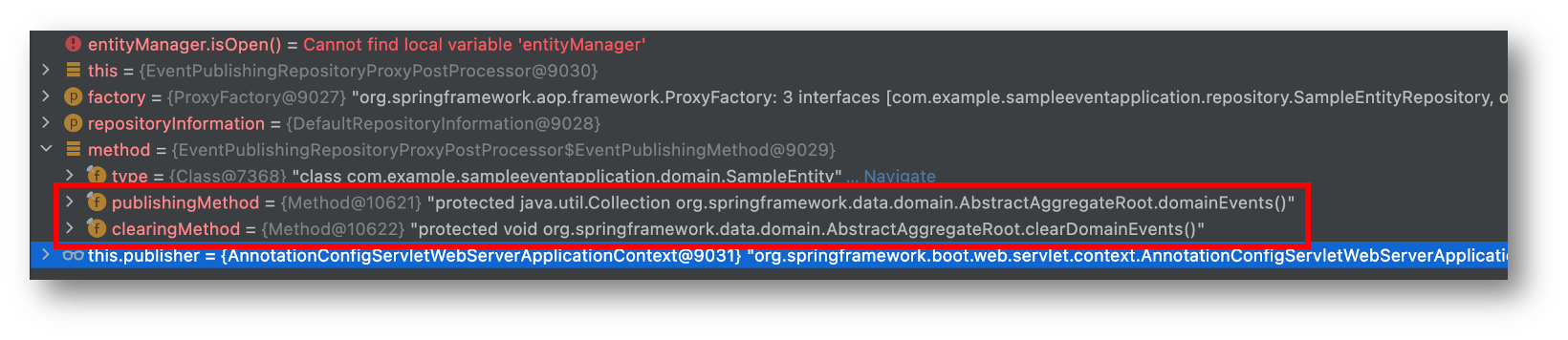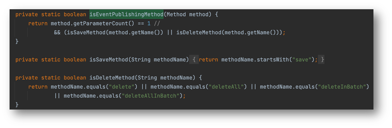 이렇게 등록된 후에는 앞에서 봤던 것 처럼 JPA 메서드 네이밍을 확인해서 이벤트를 발행할지 처리를 진행하게 된다.
