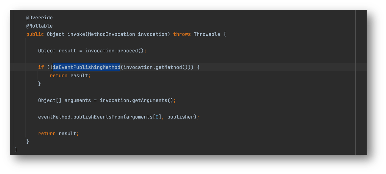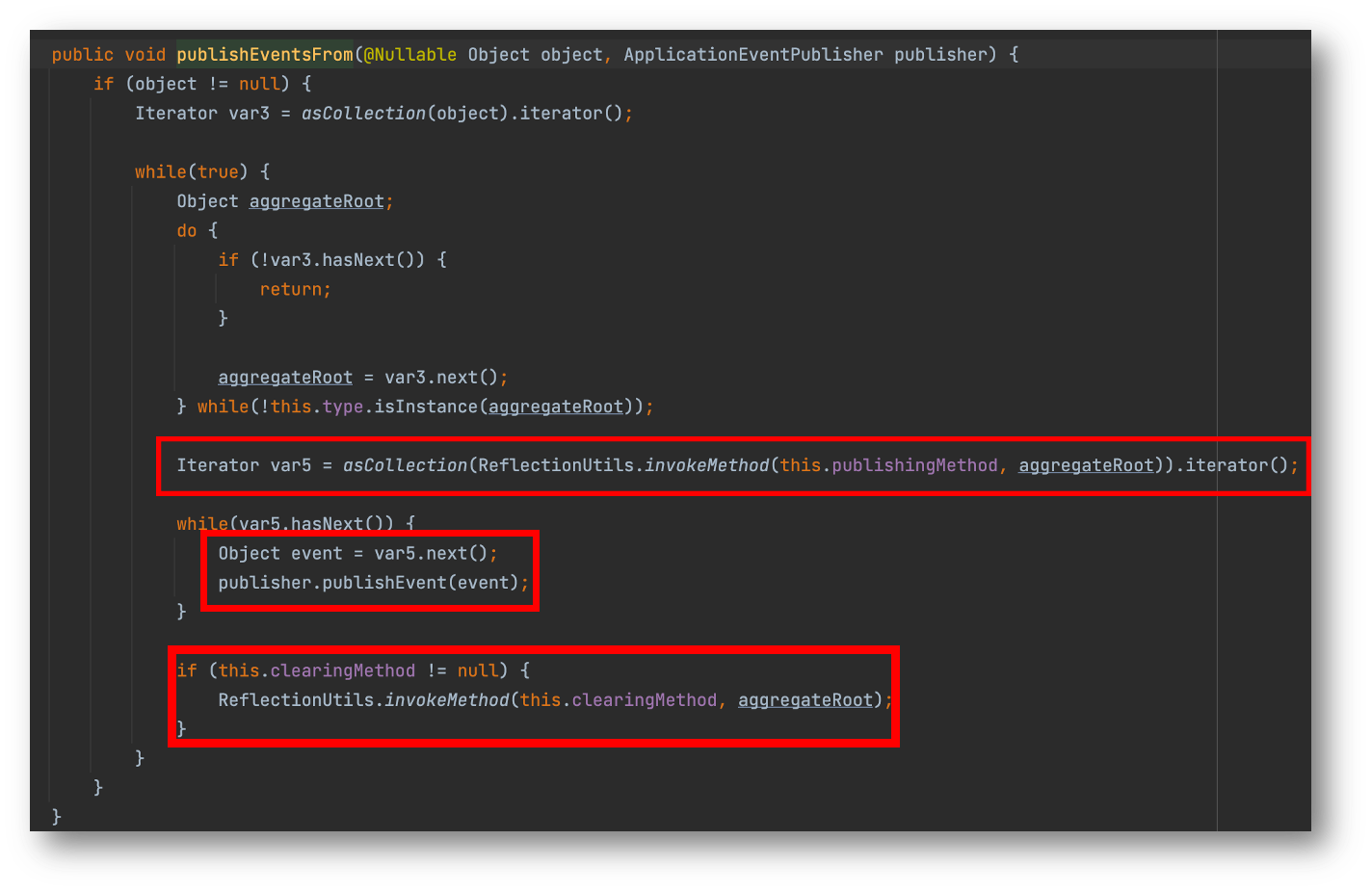 위와 같이 엔티티마다의 @DomainEvents, @AfterDomainEventPublication 를 찾아서 등록해준다. 네이밍에서 알 수 있듯이, 발행할 이벤트 리스트를 반환하기 위한 메서드와 반환 후에 초기화 해줄 메서드 정보를 가지고 있는 모습을 볼 수 있다.