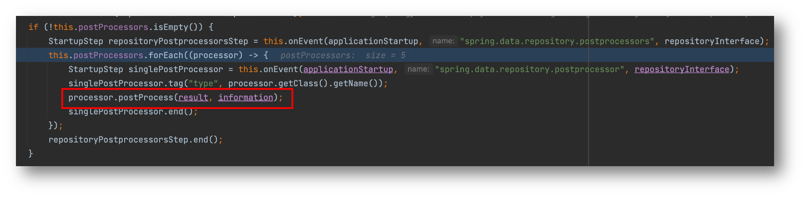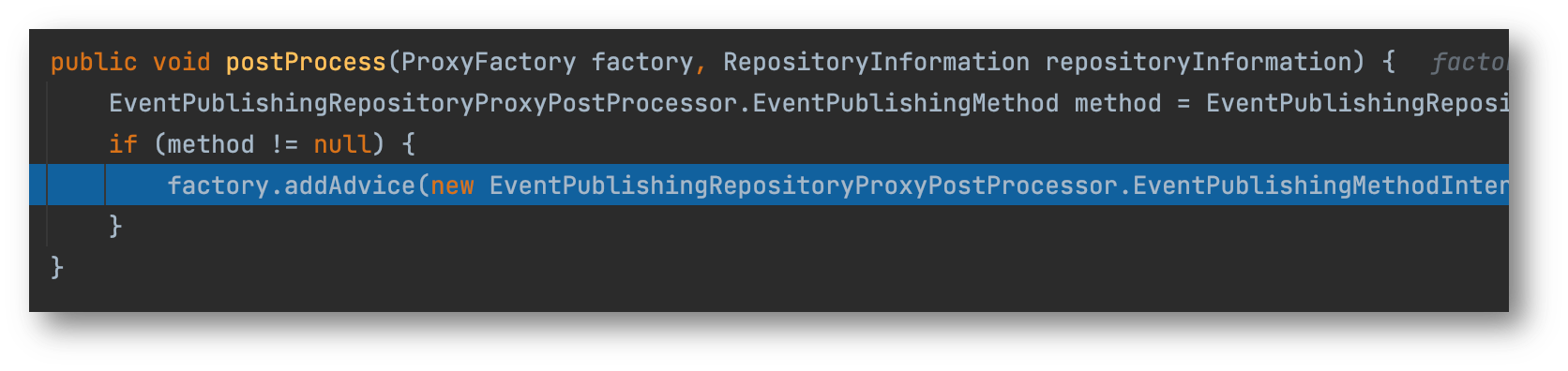 위처럼 RepositoryFactorySupport에서 repository 관련 여러가지 processor들을 등록해주고, 그중에 EventPublishingRepositoryProxyPostProcessor가 있으며, postProcess() 를 통해서