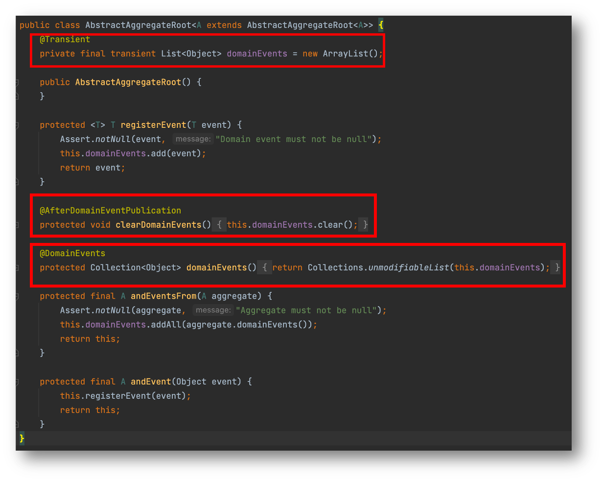 Entity 마다 공통 처리가 필요한 것들을 상속받을 객체로 만들어서 관리중인데, 여기에 저 Spring Data에 있는 AbstractAggregateRoot도 포함이 되어있다. 그렇기 때문에 Entity 마다 registerEvent() 를 사용해서 이벤트를 등록할 수 있었다. registerEvent() 를 하게되면, domainEvents에 이벤트를 추가하게 된다. 여기만 봐도 registerEvent를 한다고 이벤트가 발생되지는 않겠구나 싶었다. @AfterDomainEventPublication이 붙은 메서드는 등록된 domainEvents들을 clear 해주고, @DomainEvents가 붙은 메서드는 등록된 이벤트들을 반환해주는 역할을 수행한다. 두 어노테이션이 붙은 메서드는 실제로 Spring이 올라가면서 어딘가에 가지고 있게 된다.
