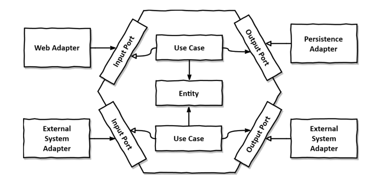 헥사고날 아키텍처에 항상 거론되는 이미지이다. Adapter, Input, Output, Usecase, Entity 크게 5개의 분류로 되어 있는데, 처음에 그림만 봐서는 무슨말인지 잘 몰랐다. 심지어 그림을 보고 코드를 봐도 이해하기 힘들었다.